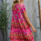 This striking bohemian dress features gorgeous floral border print and a Dolman short sleeve design. With a tiered design, this dress will be your go-to staple this summer!Β