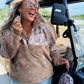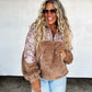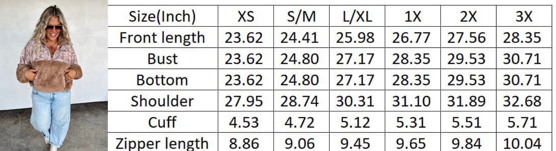 Our cute new SHERPA CAMO PANELED pullover offers a perfect blend of comfort and practicality. Features a half zip mock neck, kangaroo front pockets, elastic wrist bands, and side cinch adjustable bands to make the top a semi crop style or leave it un-cinched for a full length look.