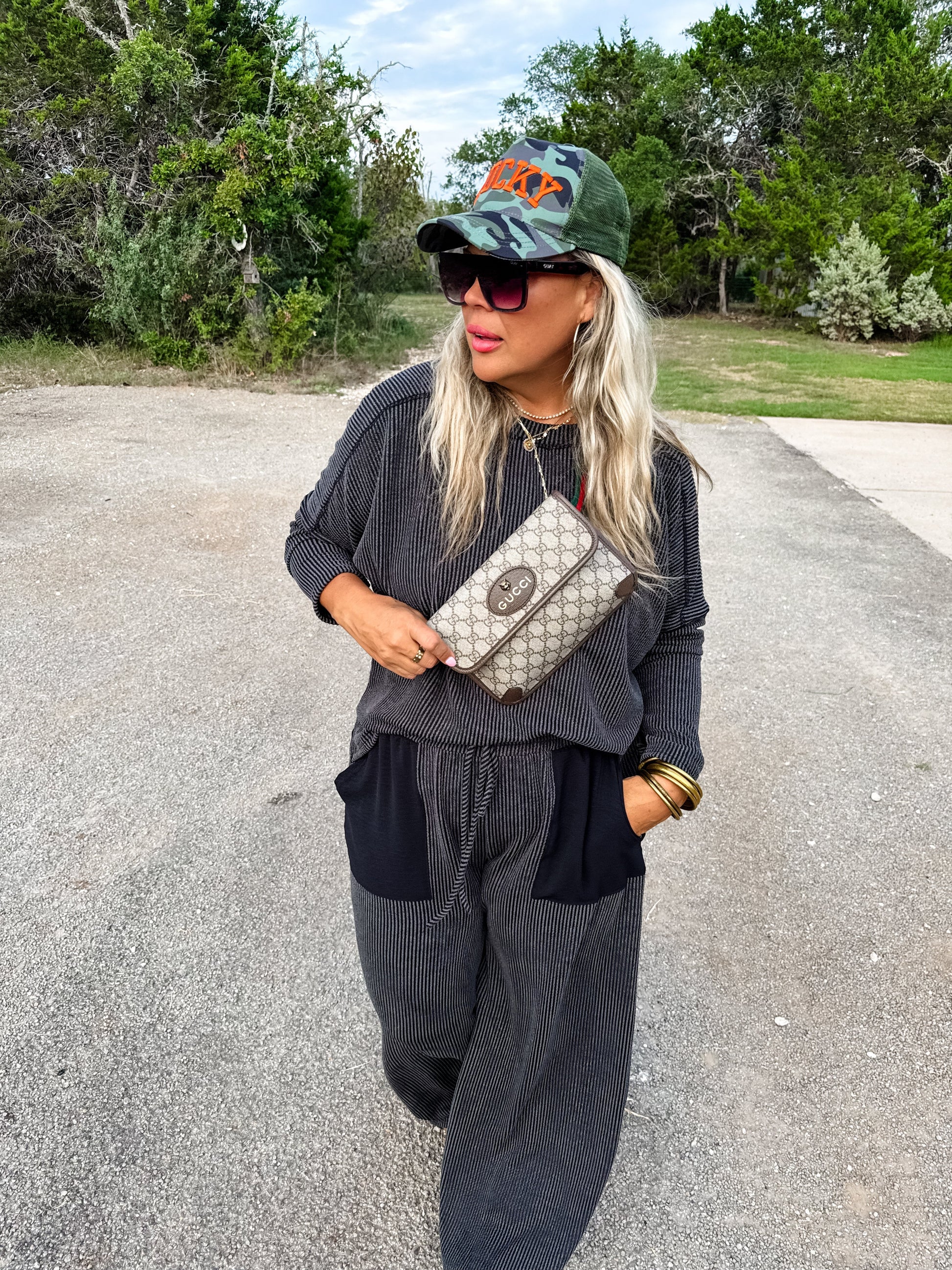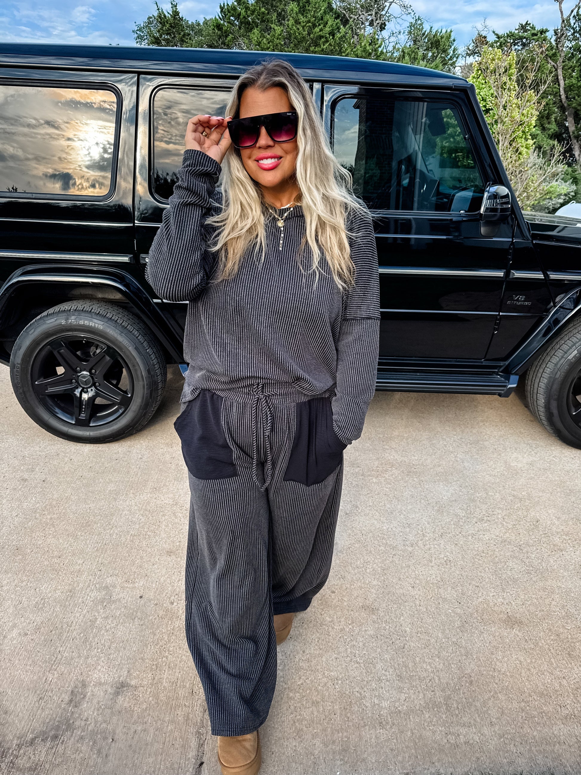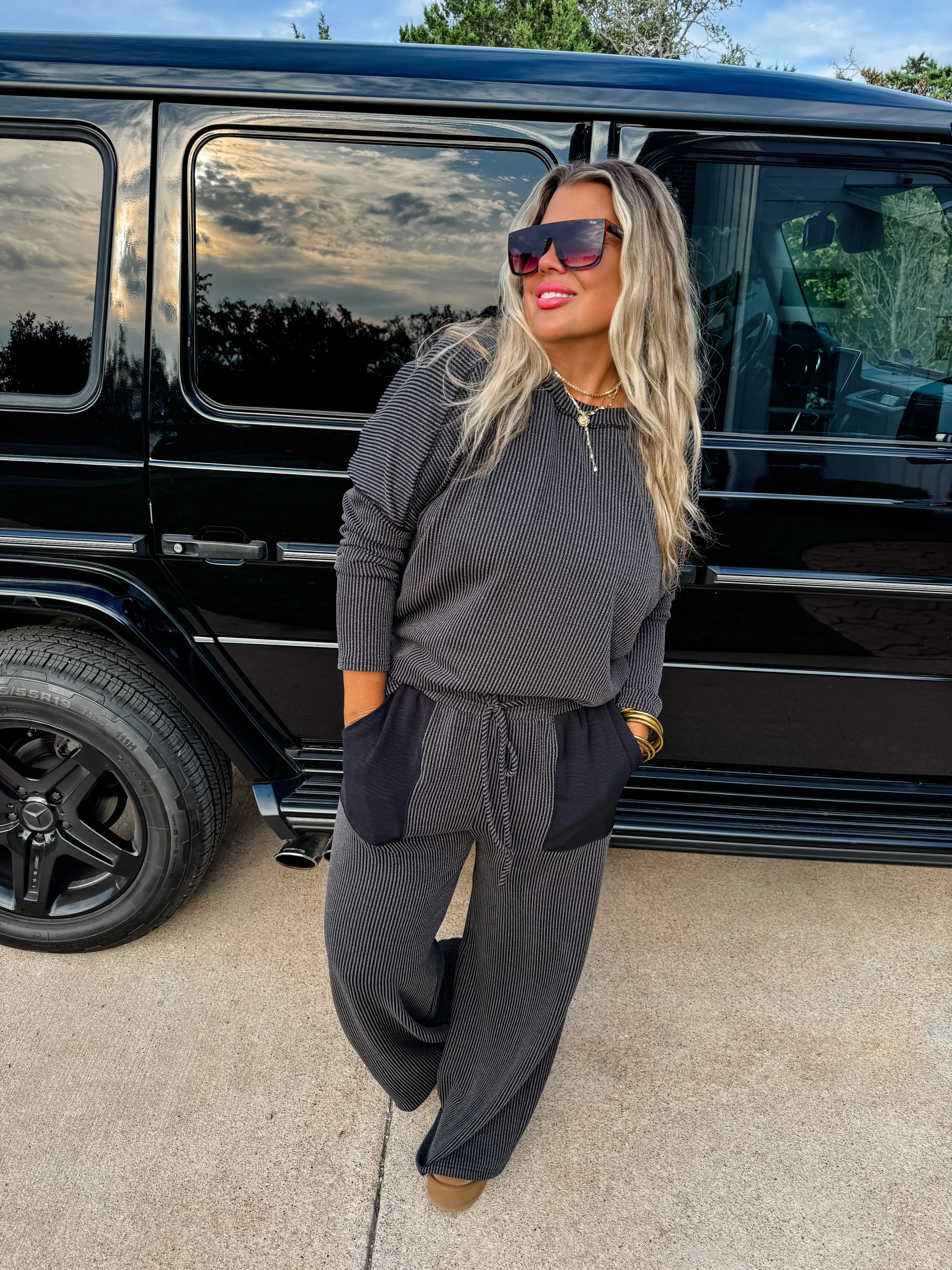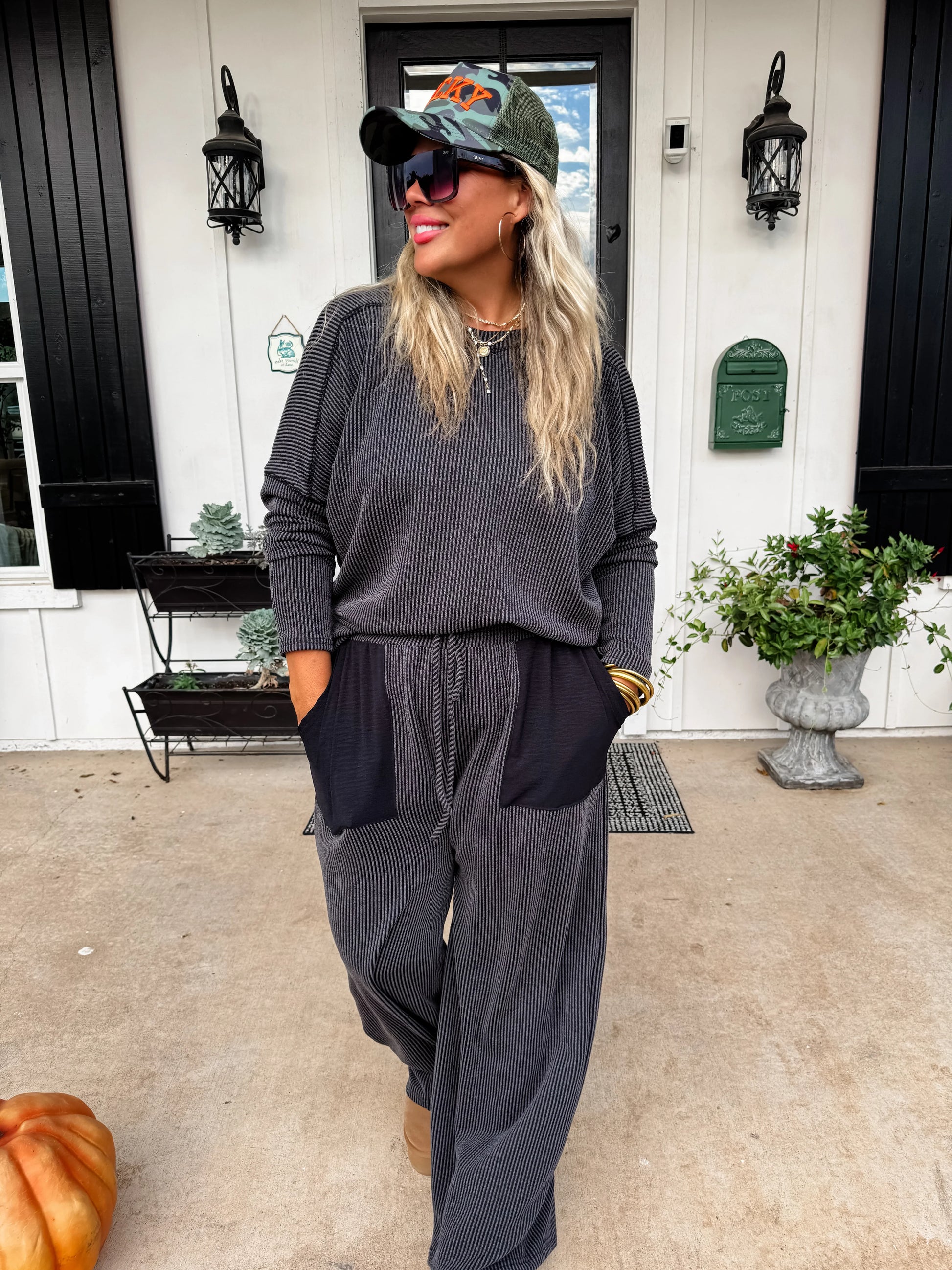 Introducing the PANT set version of our super popular "Brently" short sets. Featuring airflow fabric contrast pockets on the stretchy ribbed pants! Top features a boat neck and thumbhole cuffs! This set is as comfortable as it is stylish.